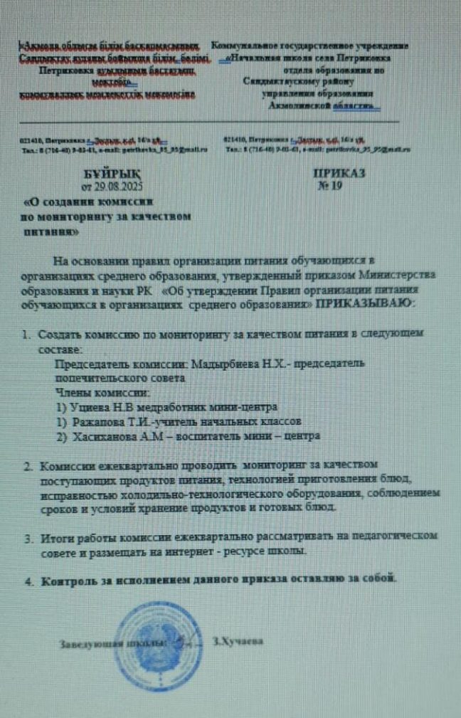 2025-2026 оқу жылына тамақтану сапасына мониторинг жүргізу жөніндегі комиссия құру туралы бұйрық