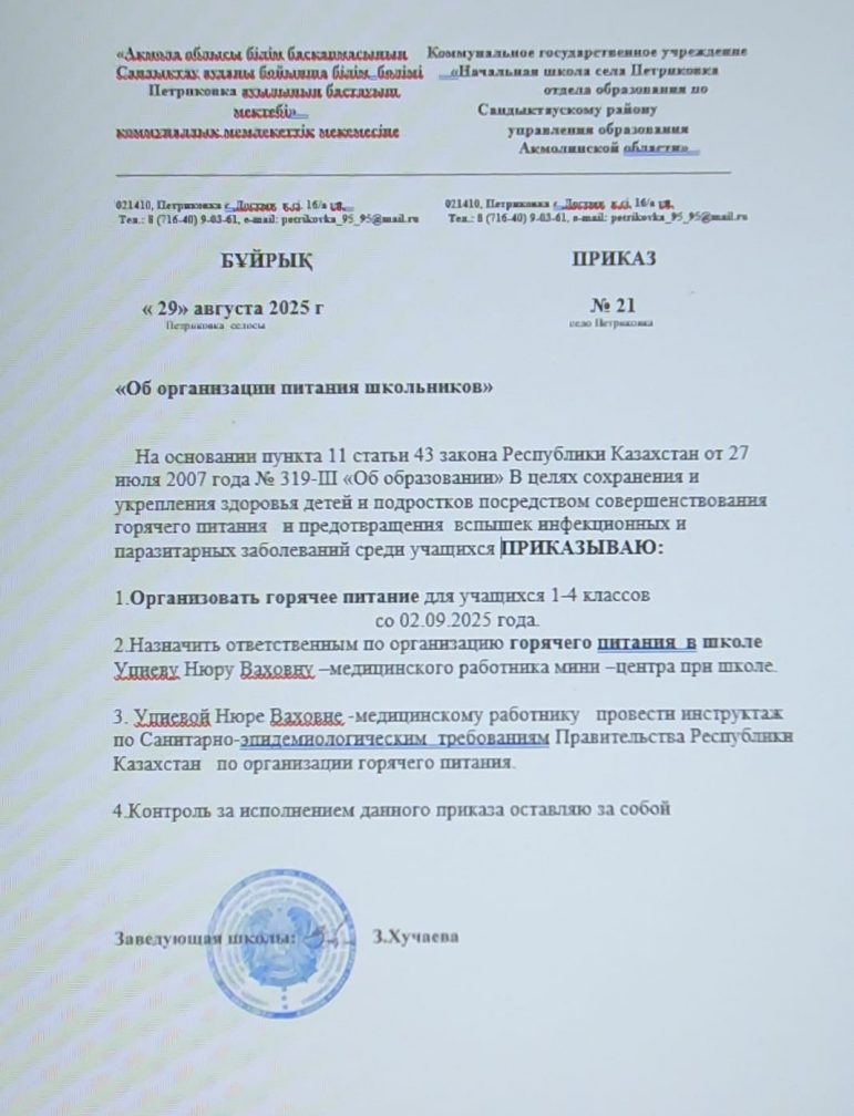 2025-2026 оқу жылына арналған мектепте тамақтануды ұйымдастыру туралы бұйрық